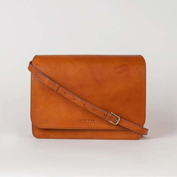 Model image of Audrey cognac classic leather crossbody bag with adjustable leather strap