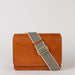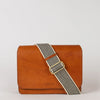 Audrey crossbody bag in cognac classic leather. Ft. checkered webbing strap. Front product image.