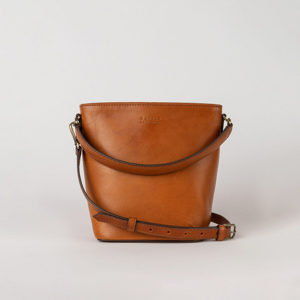 Small Cognac Bucket bag. Removable long strap. Front product image