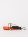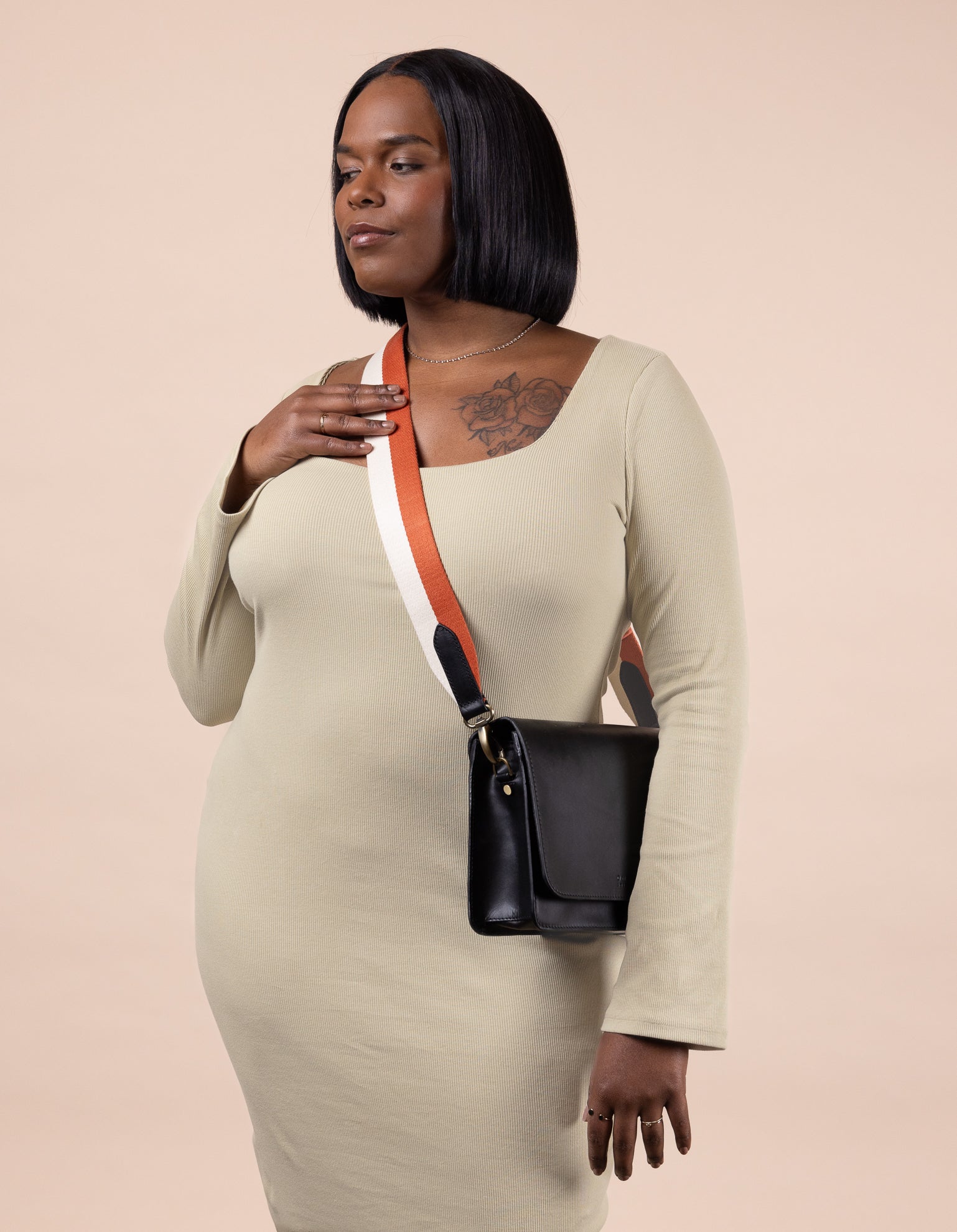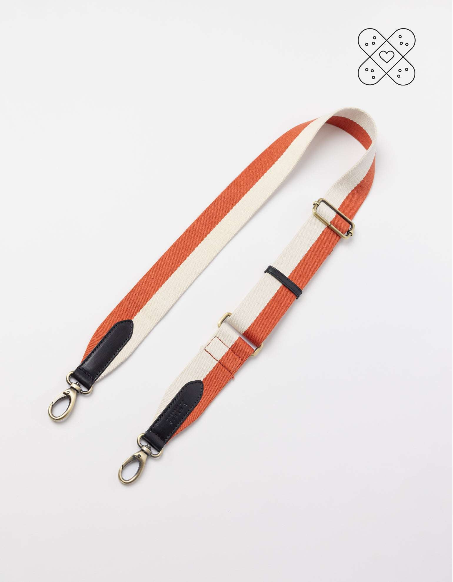 Transform your handbag with our striped webbing strap made from GOTS certified recycled cotton and smooth classic leather. The two-tone white and copper colorway matches any outfit while making that statement you are looking for. Convenient dog hooks make for an effortless swap. Add this strap to any bag, our favorites are Audrey and Bobbi Midi. Rest assured, it’s ready to add a touch of style to your ensemble!