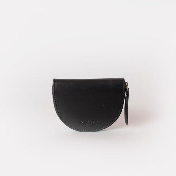 Laura Purse Black Classic Leather. Round moon shape coin purse unisex wallet. Front product image.