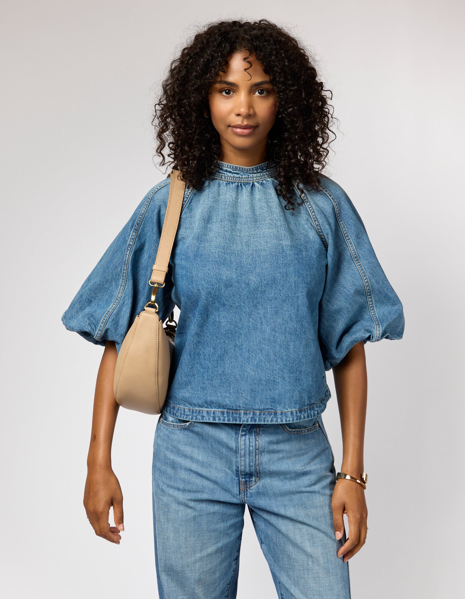 Female model in denim outfit with sand coloured leather bag on shoulder