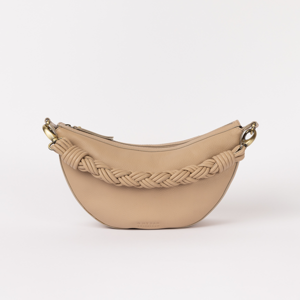 Front view of Leo in Sand-coloured leather with leather crossbody strap