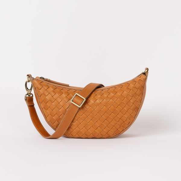 Leo Woven comes with one adjustable leather strap, designed for crossbody wear. The handwoven leather exterior gives it a structured yet relaxed silhouette, complete with a zipper closure, a spacious main compartment, an internal zip pocket, and a slip-in pocket.