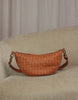 Model wearing "Leo" bag in woven "wild oak"-coloured  leather