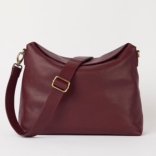 Sienna in rich Dark Cherry makes an effortless statement. Crafted from supple soft grain leather, she features a magnetic flap, zip pocket, and a roomy interior that fits up to a 14-inch laptop. With both a braided shoulder strap and an adjustable leather crossbody strap, she moves easily from your morning commute to evening plans.