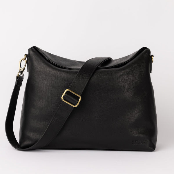 Front product image of Sienna black soft grain leather crossbody work bag with adjustable leather strap
