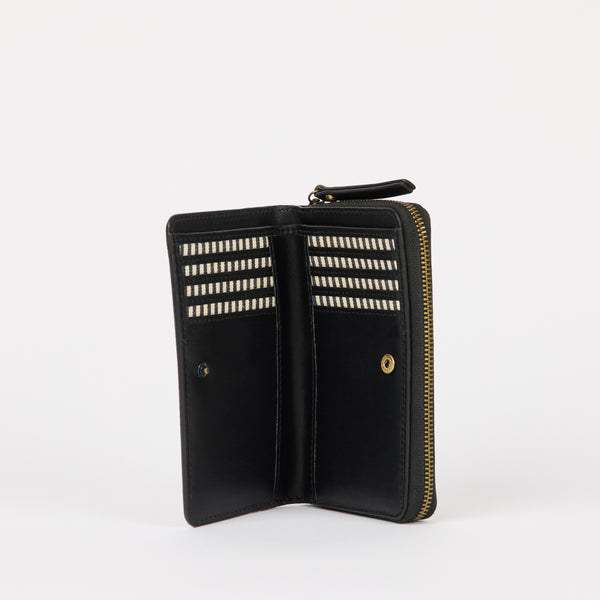 The Jett Wallet features 8 card slots, a full-length cash compartment, and a zipped coin pocket. Two interior slip-in pockets add extra organization, all secured with a snap button closure. Finished with antique brass hardware and our signature OCS and GRS certified cotton lining.