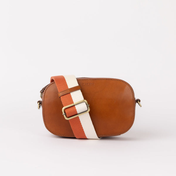 Our signature striped webbing strap adds a touch of flair, and you can easily switch it up with any additional strap for a fresh look. Compact yet spacious enough for the latest iPhone, as well as your wallet, sunglasses case and keys, Maya exudes effortless style. In our signature Cognac Classic Leather, the streets will be your runway.