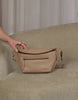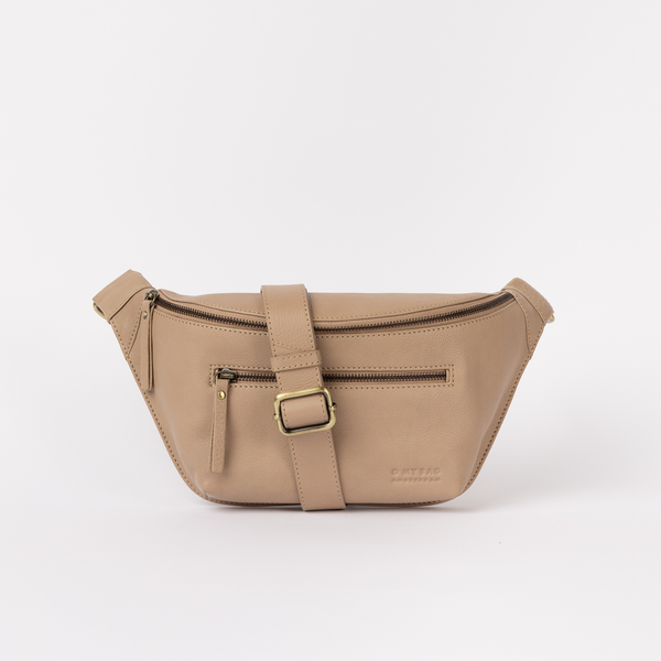 Front view of Drew Bumbag in Sand coloured leather with the webbing strap