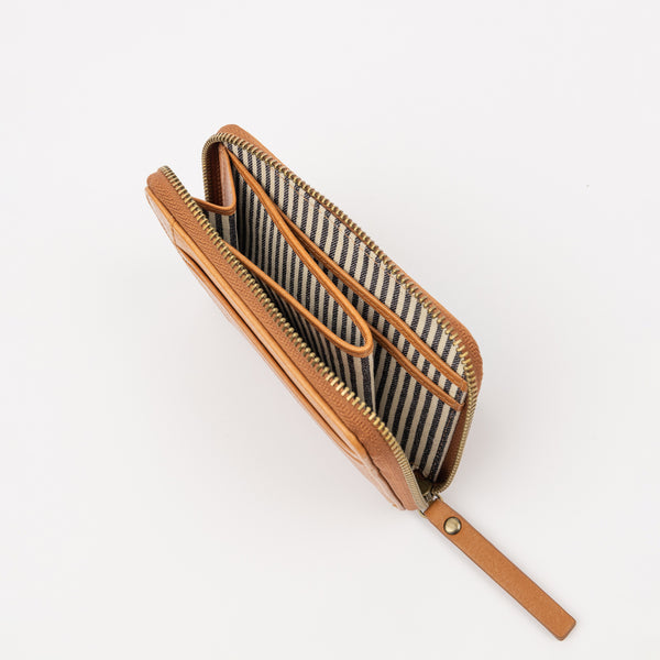 cognac wallet laid down on white background - close up of open zipper and zipper handle