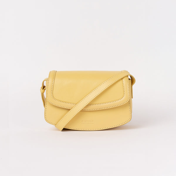 Front view of Kendalini in Butter Yellow-coloured leather with strap
