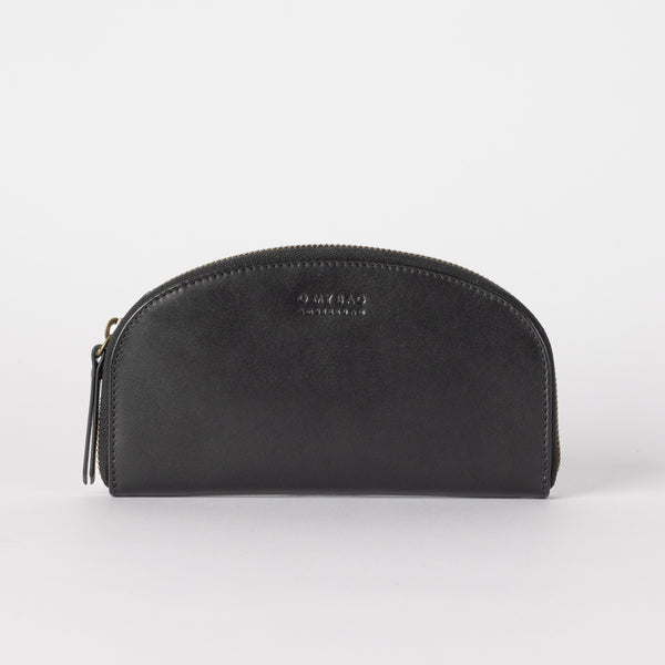The Blake Wallet has a zip-around closure and a rounded crescent silhouette. Inside, there are eight card slots, two compartments for cash or receipts, and a zip pocket for coins.