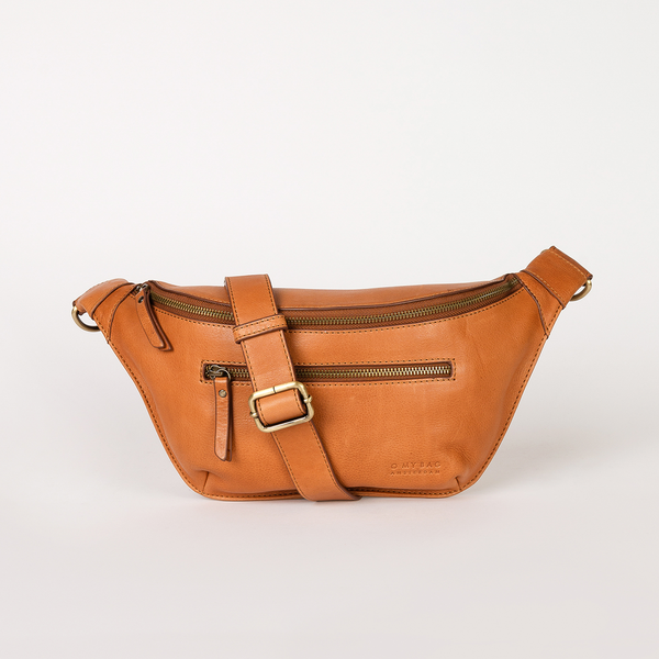 Drew Bum Bag in Wild Oak soft grain leather with adjustable leather strap. Front product image.
