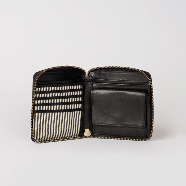 The Sonny Square Wallet features a secure zip-around closure. Inside, there are two compartments for bills and receipts, a popper-closure coin pocket, and four card slots.